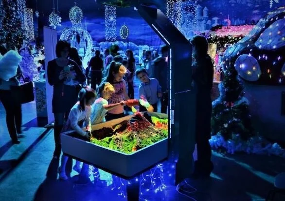 Le contenu de haute luminosité est projeté sur le sable, créant un monde 3D entièrement interactif. Grâce à la Sandbox, les usagers peuvent voir de la lave couler, les océans tourbillonner, l’herbe pousser …